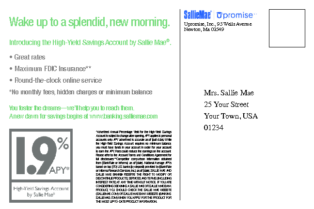 The flip side of Sallie Mae savings postcard.