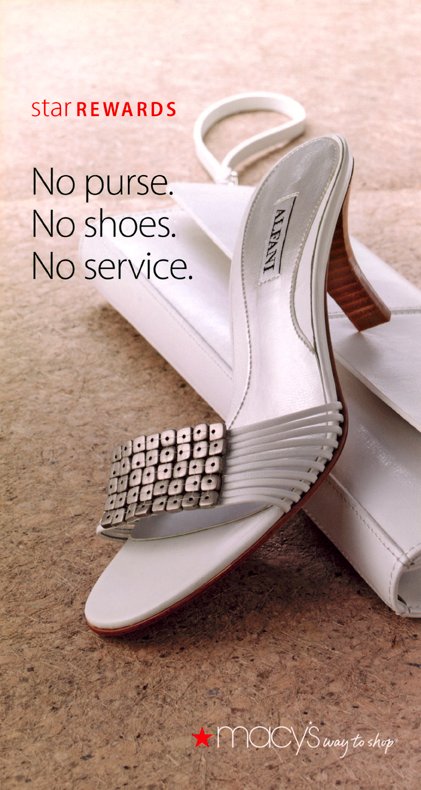 Unfettered by catalog & rop restrictions, I utilize a conversational tone in magazine, postcard, transit and broadcast campaigns. Here, a Macy's sale on handbags and footwear demanded a clean new postcard approach.