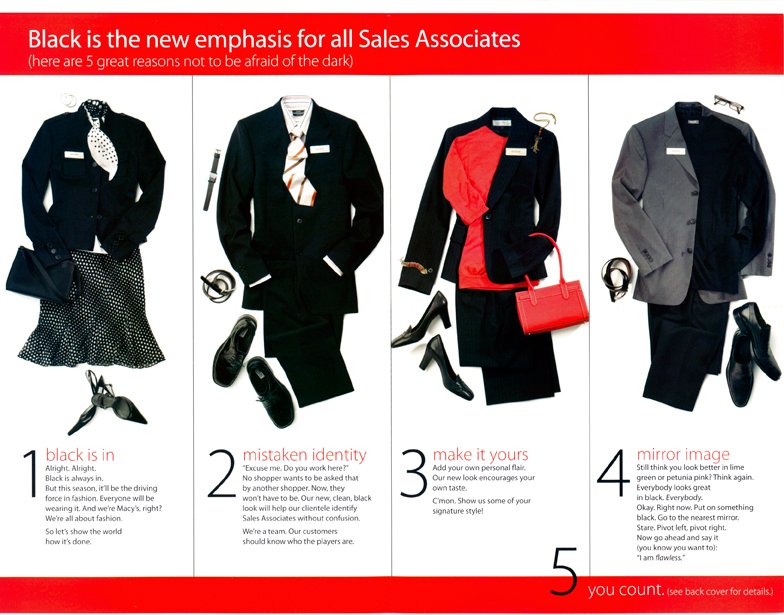 Corporate management encouraged all sales staff to dress in black for a sense of unity throughout every store. I developed this 5-step motivational pamphlet, distributed to all Sales Associates, to announce the directive.