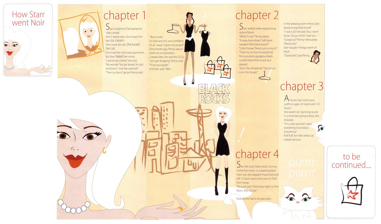 Z-card shopping-bag stuffers were created for high-level customers. I developed a 'chic-lit' story here to acquaint shoppers with the power black brings to any wardrobe.