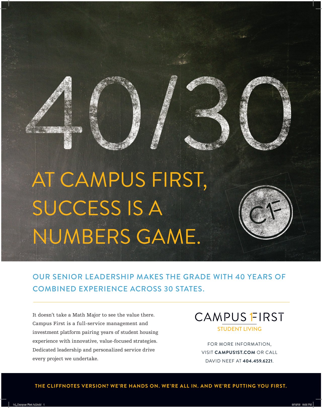 Under contract with Resource Branding, I wrote ads for Campus First developers and management. In branding, they were intent on emphasizing experience over competitors in the industry.