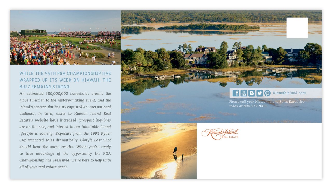 To capitalize on the excitement of the 2012 PGA Championship held on Kiawah Island, three postcards were sent to perspective home buyers emphasizing the explosive interest in Island properties following the tournament.